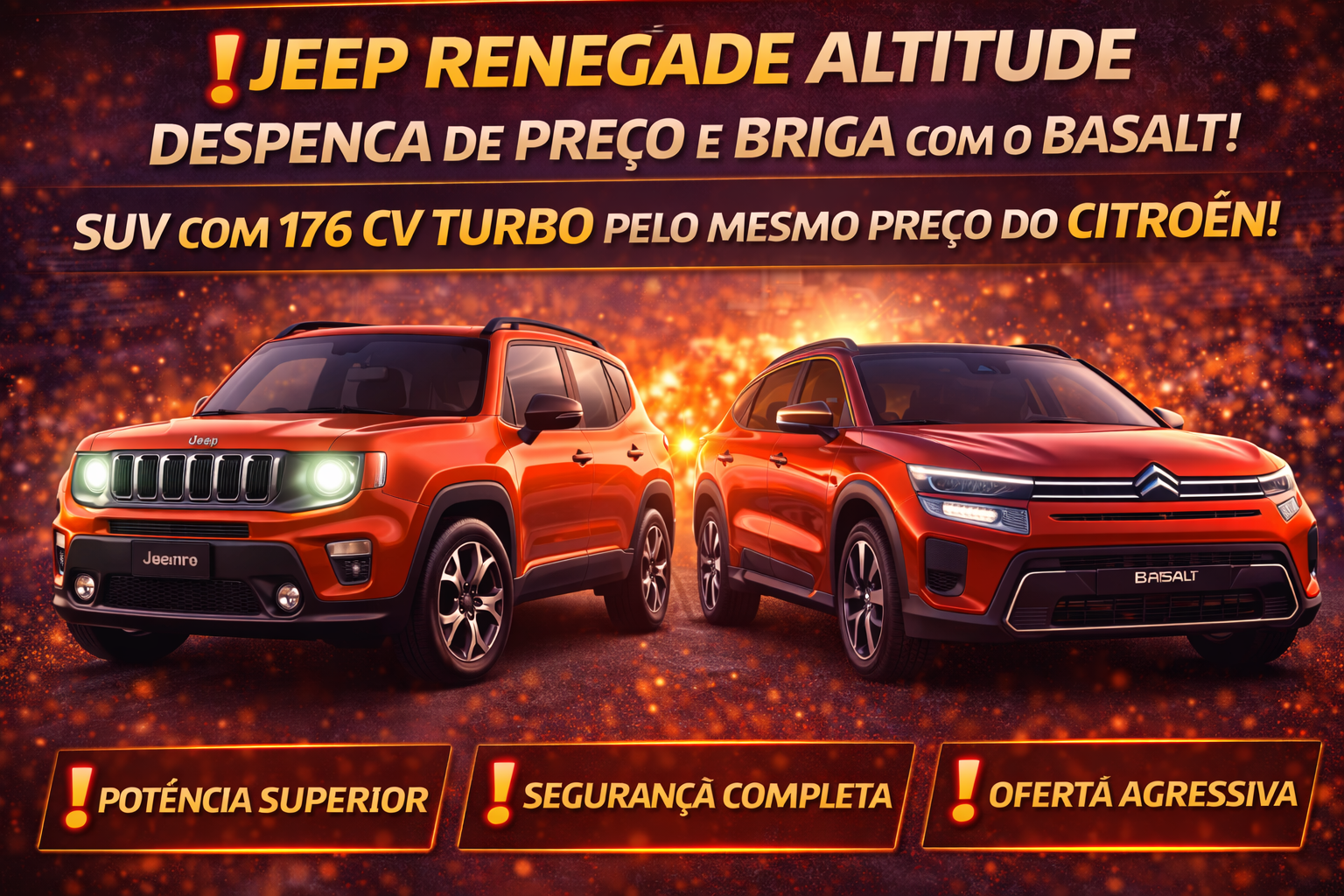 O mercado brasileiro de SUVs compactos vive um momento extremamente competitivo. No entanto, a Jeep decidiu reagir de forma agressiva e estratégica. A marca reduziu em R$ 21 mil o preço do Renegade Altitude 2026, fazendo o modelo cair de R$ 147.990 para R$ 126.990. Com isso, ele passa a disputar compradores na mesma faixa do Citroën Basalt topo de linha, elevando o nível da comparação.